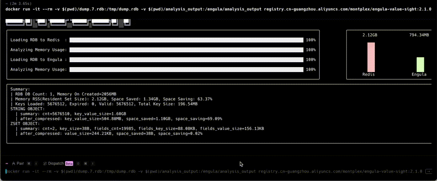Engula ValueSight is a diagnostic and evaluation tool that enables users to quantitatively assess the benefits of adopting Engula in real-world scenarios. It allows one-click comparison of memory usage between Engula and Redis using actual production data, producing intuitive insight into Engula’s efficiency.